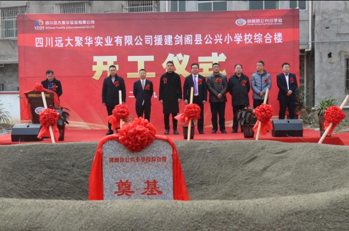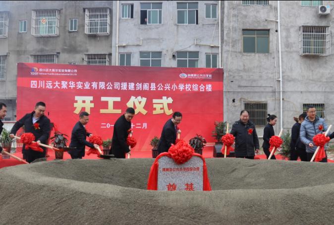 冬阳灼灼静沐灵杰宝地,鞭炮声声响彻校园天空。12月31日上午,四川远大聚华实业有限公司援建剑阁县公兴小学校综合楼开工仪式在公兴小学隆重举行。四川远大聚华实业有限公司董事兼财务总监鲍斌潘同志、宏乾建筑公司副总经理张礼泽同志、剑阁县政府副县长郭扭只同志、县教育局局长王晓明同志、中国银行四川分行挂职剑阁县扶贫开发局副局长唐良富同志、剑阁县公兴镇党委书记母勇林同志和镇政府党政领导干部,以及公兴小学师生等约900人参加了开工仪式。开工仪式由剑阁县扶贫开发局局长郑东方主持。