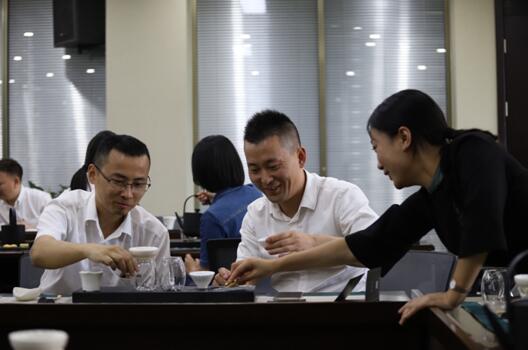 来自集团总部领导、行政后勤服务、职能部门以及业务部的近三十余名茶艺爱好者在会议室学习茶叶知识、茶道礼仪规范、茶艺操作技巧等。